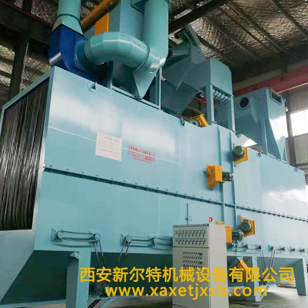 兰州通过式抛丸清理机,清理过程中由电气控制的可调速输送辊道将钢结构件或钢材送进清理机室体内抛射区,其周身各面受到来自不同坐标方位的强力密集弹丸打击与磨擦,使之其上的氧化皮、锈层及其污物迅速脱落,钢材表面就获得一定粗糙度的光洁表面,在清理室外两边进出口辊道装卸工件。落入钢材上面的弹丸与锈尘经吹扫装置吹扫,撒落下来的丸尘混合物由回收螺旋输送到室体漏斗、纵横向螺旋输送机汇集于提升机下部,再提升到机器上部的分离器里,分离后的纯净弹丸落入分离器料斗中内,供抛丸循环使用。抛丸清理中产生尘埃,由抽风管送向除尘系统,净化处理后的净气排放到大气中,颗粒状尘埃被捕捉收集。