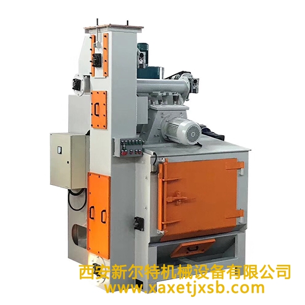 在清理仓内加入规定数量的工件后,大门关闭,机器启动,工件被滚筒带动,开始翻转,同时抛丸器高速抛出的弹丸形成扇形束,均匀地打击在工件表面上,从而达到清理的目的。
